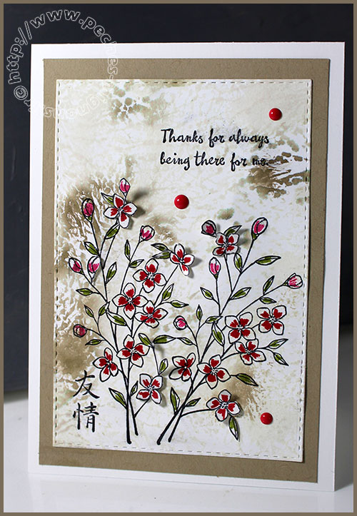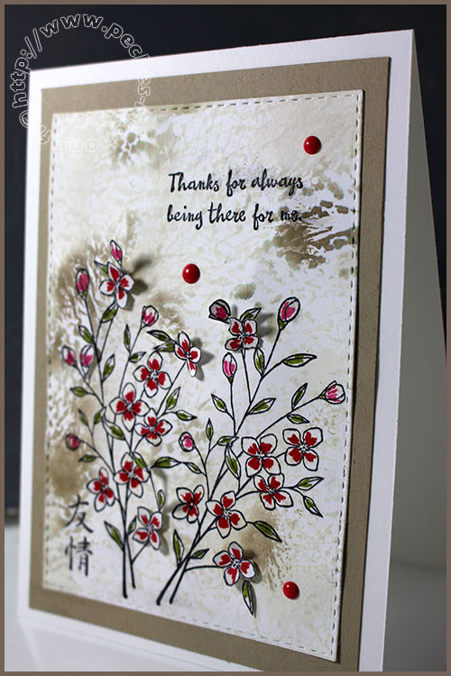 Ma carte, très simple, j’ai mis quelques fleurs et feuilles en relief ce qui lui donne un peu de profondeur. Je ne suis pas mécontente du résultat, pour obtenir ces taches plus foncé j’ai simplement rajouté sur mon essuie tout bien essoré quelques gouttes d’encre puis je l’ai de nouveau froissé.