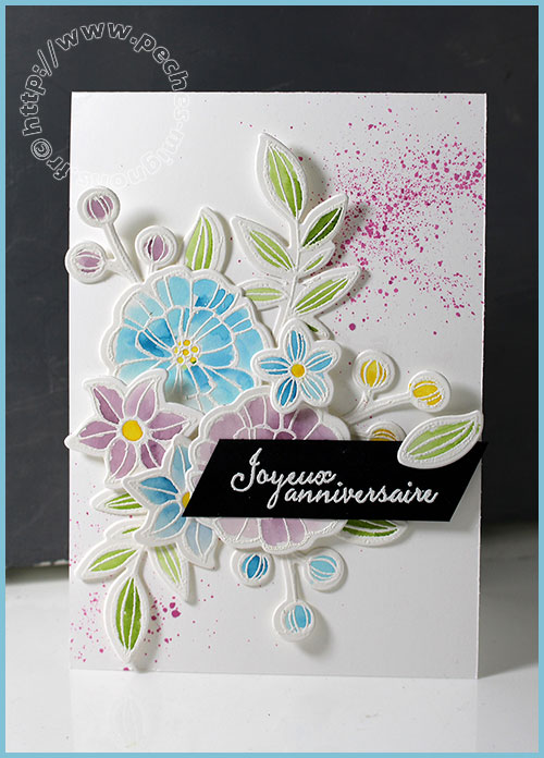 1. Pétillante et superbe !!! J’adore les fleurs ainsi embossées et aquarellées, le rendu est top ! Scrapbizzzz