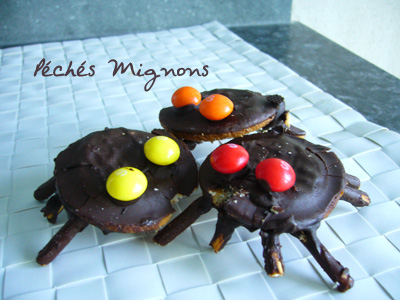 Cassez les mikado en 5 morceaux, (mangez les bouts non chocolatés) et piquez 8 morceaux dans le Pim’s (côté non glacé). Scellez avec du chocolat fondu. Collez également 2 yeux par araignées. Laissez refroidir 1/2 heure au frais et dévorez les !