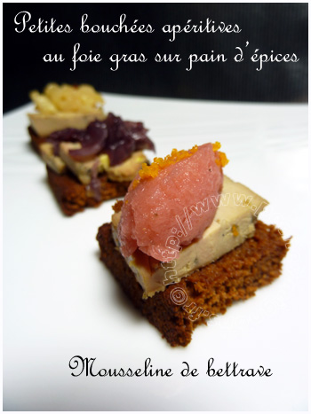 Dressage : Disposez le foie gras sur les morceaux de pain d’épices. A l’aide de 2 petites cuillères formez des quenelles de betterave et placez dessus. Décorez de zeste d’orange. Pour les oignons, disposez une petite cuillère sur le foie gras, je n’ai pas mis de décoration car j’ai trouvé que cela suffisait. Et pour la poire, comme pour l’oignon, placez une petite cuillère de garniture et décorez d’un tour de moulin de 5 baies.