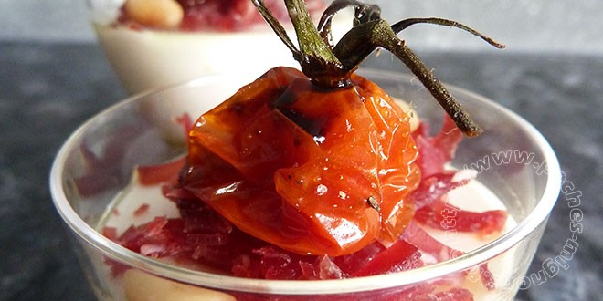 Petite panacotta de parmesan sur lit de pesto, effilochée de bresaola et tomate confite