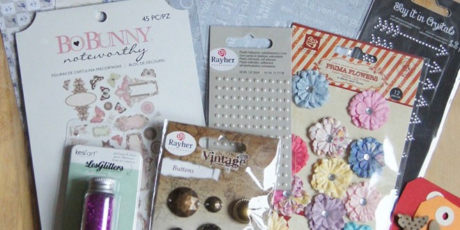 Le lot comprend une tote, des fleurs et des strass prima, des boutons et des perles Rayher, des paillettes kesiart, des étiquettes Bo Bunny, 4 feuilles 15×30 artemio, un tampon love et des tags et papillons.
