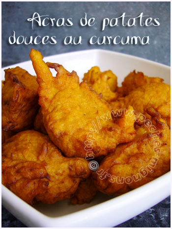 Pelez les patates douces et coupez les en dés. Faites les cuire à l’eau salée pendant 20 à 25 minutes (piqué les cubes de patates avec un couteau pour vérifier la cuisson). Égouttez les et écrasez les en purée. Ajoutez le curcuma, et les graines, salez et poivrez.  Dans un saladier, mélangez la farine, la levure, 1 pincée de sel, les œufs légèrement battus, et l’eau. Incorporez ensuite la purée. Faites chauffer l’huile à 180°C dans une casserole. A l’aide de deux cuillères à café, prélevez des petites quantités de pâte et déposez les dans le bain d’huile. Faites frire 5 à 6  acras à la fois, environ 5 minutes. Égouttez sur du papier absorbant et servez très chaud.